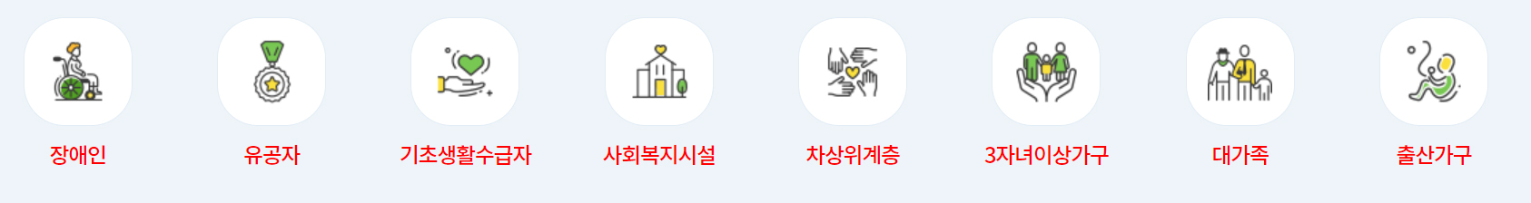 3자녀 이상 가구, 대가족, 출산가구, 기초생활수급자, 차상위계층, 국가유공자, 상이유공자, 독립유공자, 장애인 해당